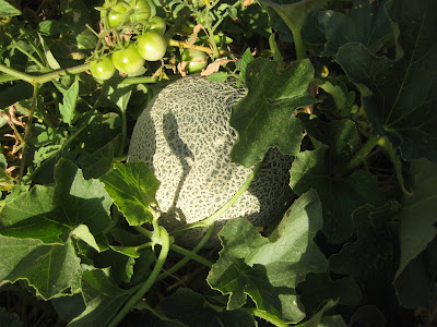 Cantaloupe (volunteer) amongst cherry tomato volunteers Almost ready! Again, I have like 14 of these plants. I am not a big fan of cantaloupe, but Mehgan is. She can easily eat 2 a day!